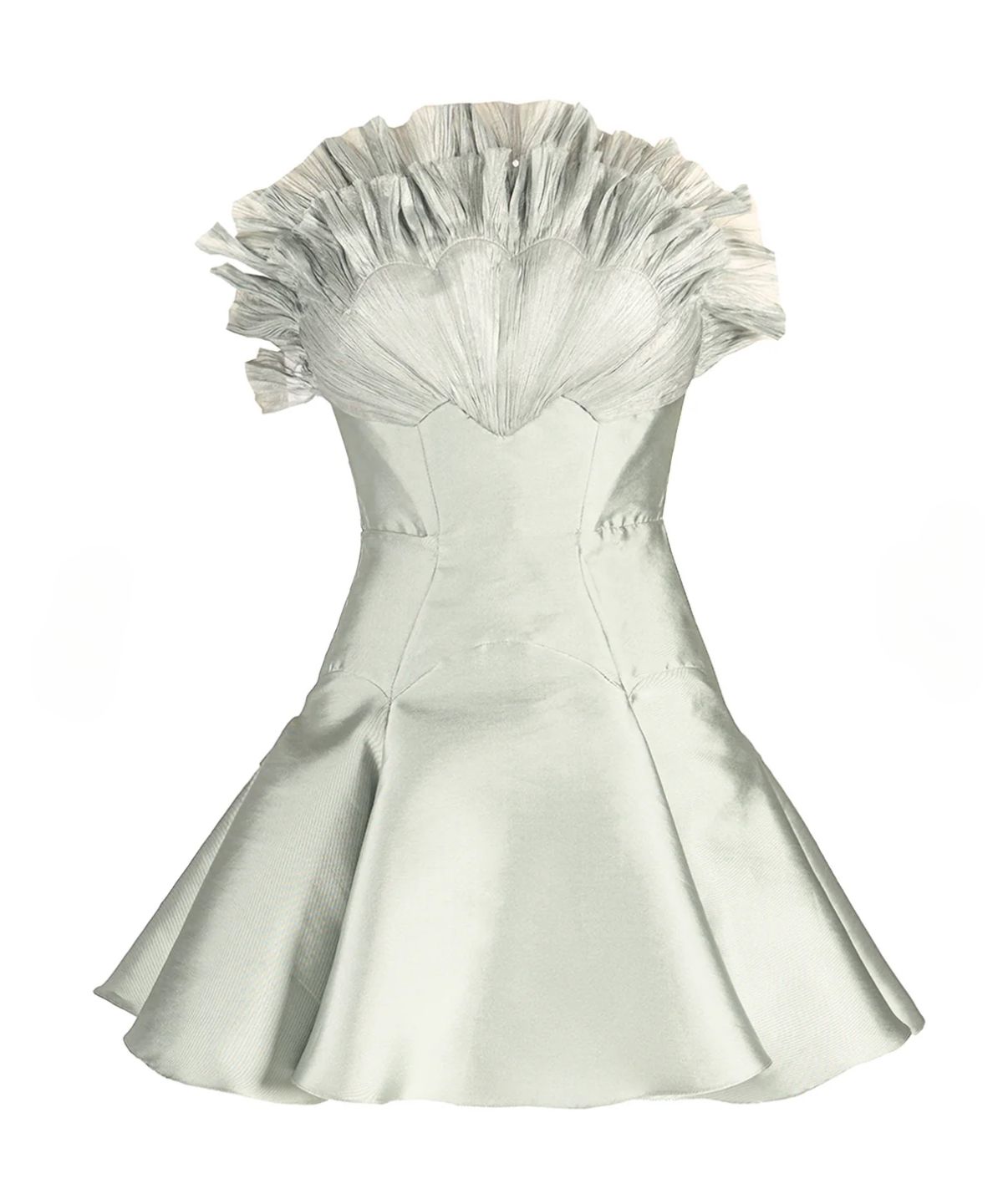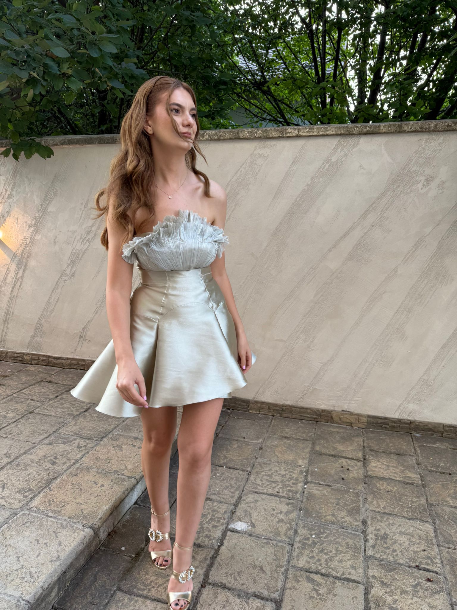Model scurt, cu fustă în formă de clopot și corset care evidențiază talia. Bustul este decorat cu plisaj delicat, în formă de inimă, ce adaugă un aer romantic și rafinat. Confecționată din material satinat, cu o textură fină și ușor lucioasă.